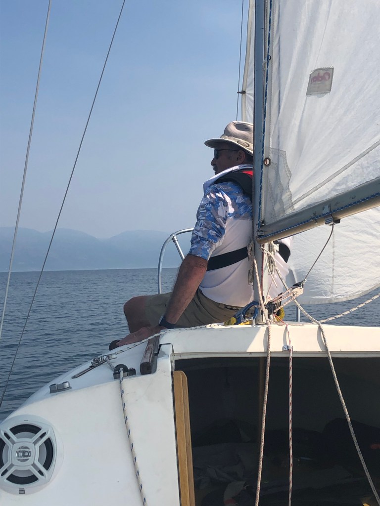 We wake the next morning and trailer the boat to the dock where we’ve rented a slip for the week. For JD and me, as novice sailors, raising the mast is still a bit intimidating, a process rife with opportunity for one misstep to result in damage or injury. That this boat ramp is steep only adds to our challenge, exaggerating the angle at which we must hoist the 28’ mast from horizontal, while missing overhead power lines. As is often the case, even at this small dock, we attract attention, and a man in an RV with California plates eyes us from inside his rig for awhile, then wanders over. He is a fisherman, although he hasn’t had much luck recently. He asks if we need any help, and JD adeptly delegates a simple yet important task for him that doesn’t require too much explanation – holding the turnbuckles of the shrouds so they stay vertical (and unbent) during the mast raising. As we work, Bob talks to us about the winds and rough waters he’s encountered over the past few days out on Flathead Lake. As we talk, a search is underway for a kayaker who capsized a few days ago in rough waters. I feel my stomach muscles tighten, reflexively. I breathe, reminding myself of our training and safety gear, and the numerous lessons we’ve already learned out on the water under sail. And ultimately, I think to myself, none of us knows when or how our time will come. I refuse to live in the grips of fear.