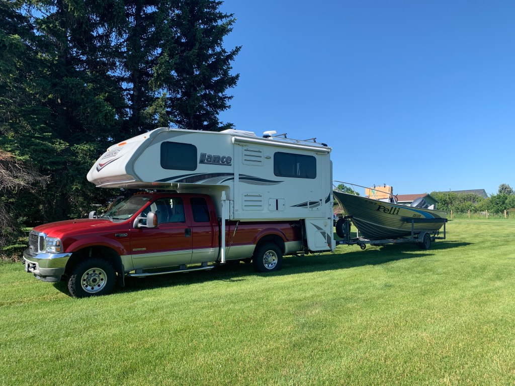 So here’s our caravan – each couple is driving its own truck camper. Lee and Kathy’s rig is towing an enclosed trailer containing two Kawasaki 650 motorcycles, 4 bicycles, 2 stand up paddle boards, 4 spare tires, associated jacks and power tools, a Blackstone griddle/grill, extra clothes/shoes, and food and drinks. JD and I are hauling our Gregor Ocean 20 fishing boat, with an 80-horse power Johnson outboard motor and a 9.9-hp Suzuki kicker. We trailered the “Pelli,” named after our last dog, all the way up from Baja California just for this adventure!