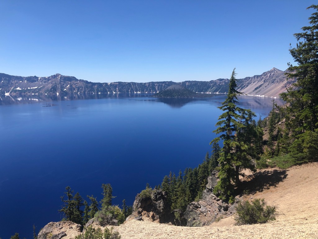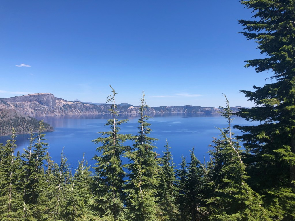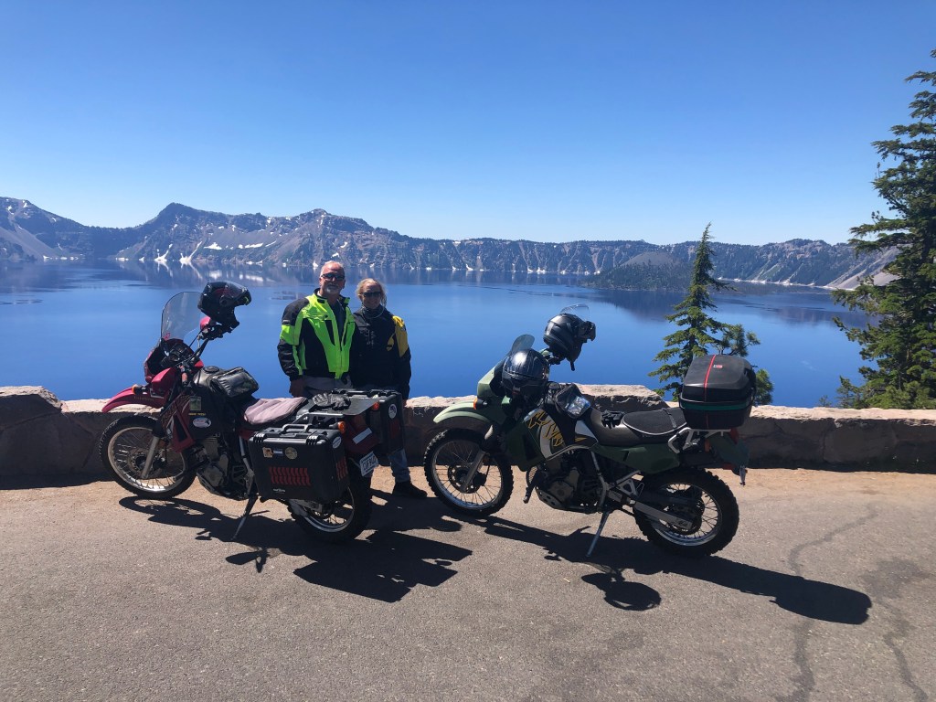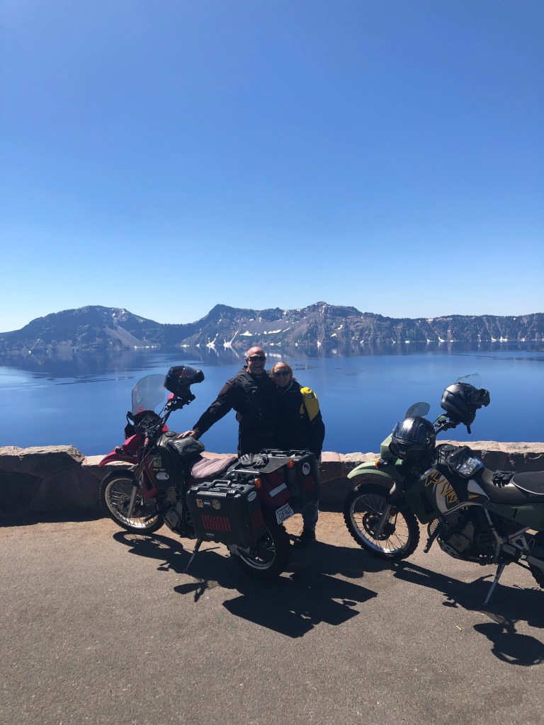 We found a sweet RV park in Cresent Oregon called Big Pines. We decided to stay a couple of days as it was quiet, reasonably priced and there was a lot of traffic on the highway going north. Camp set up is fast now that we have things better organized and we have experience setting up. Lee, Kathy and I decided to break out the bikes for the first time and motor over to Crater Lake NP. Finding all of the PPE for the bikes and double checking things took a little more time than the last time we rode together several years ago. Both bikes are Kawasaki KLR 650. The red one is the bike I rode the entire Pan American Highway. The green one I picked it up cheap while my bike was in South America. I used it to make sure aftermarket parts would fit on my SA bike. I’ve kept both of them, just cause.