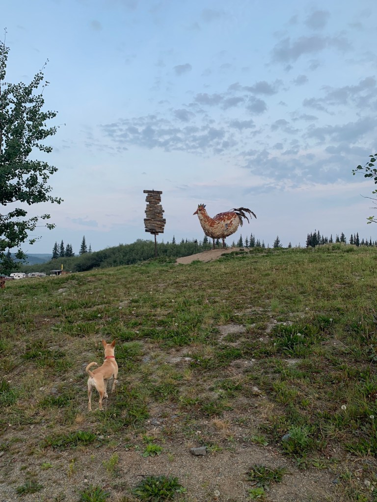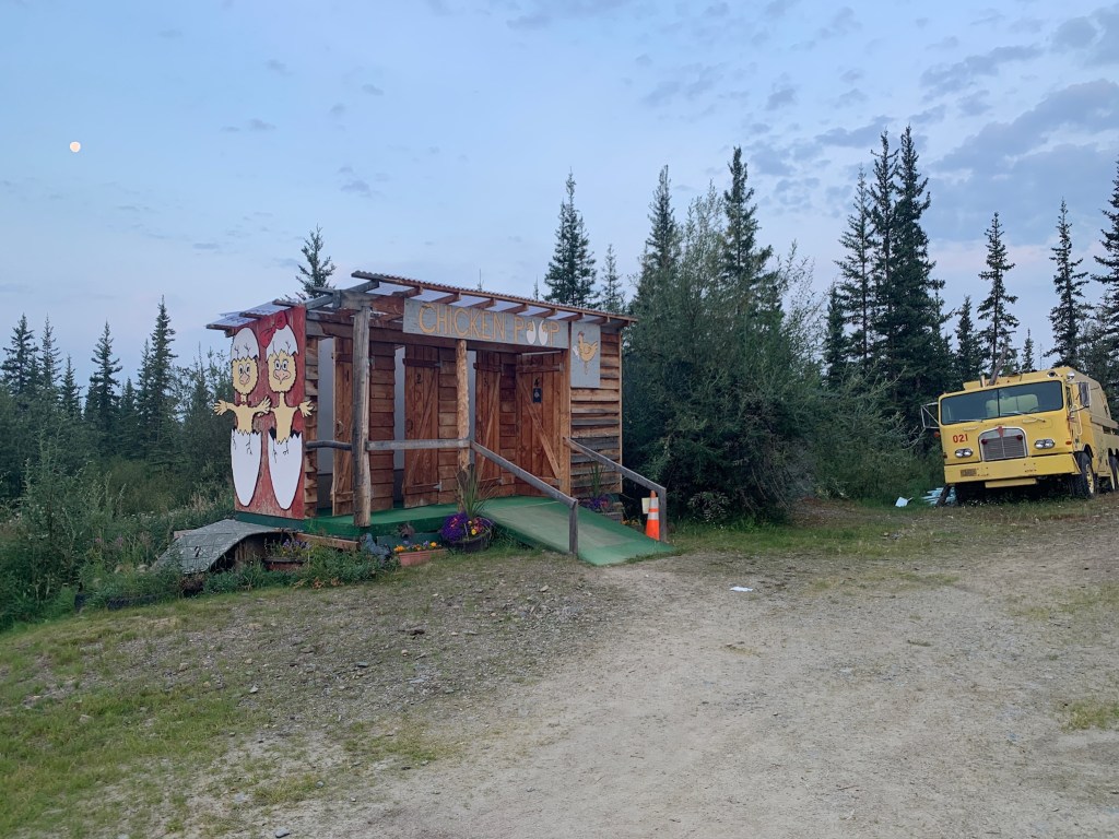 We spent a night in Dawson City, where JD, Lee and Kathy ventured through town on bicycles while I hung back at camp savoring some solitude. We walked the city blocks the next morning, then caught a ferry across the Yukon river, before venturing up the Top of the World Highway. Here, the boys broke out the motorcycles while Kathy and I drove the big rigs. After cresting the rise at Top of the World Highway, we crossed back into Alaska at Poker Creek – the highest port of entry in North America. From there, we descended back down into Chicken, Alaska, via the Taylor Highway. There, we stayed a night in an RV park and visited an old saloon and old dredge in this eclectic Alaskan town.