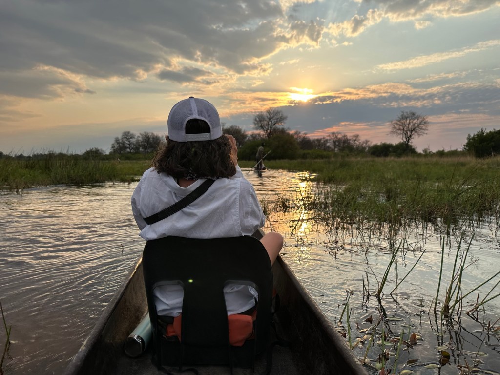 We paddled for the next hour and a half, admiring the scenery and eventually stopping for a stretch break at our turn-around point, where Punk used a hippo skull as an interpretive aide to educate our group about hippos, crocodiles, and growing up as a villager in the Delta, with parents who spoke no English. He said he was proud of knowing our language, and being able to use it to make a living sharing his tribal ancestry and culture, his country’s history of colonization and independence, and changing relationships with the natural world.
