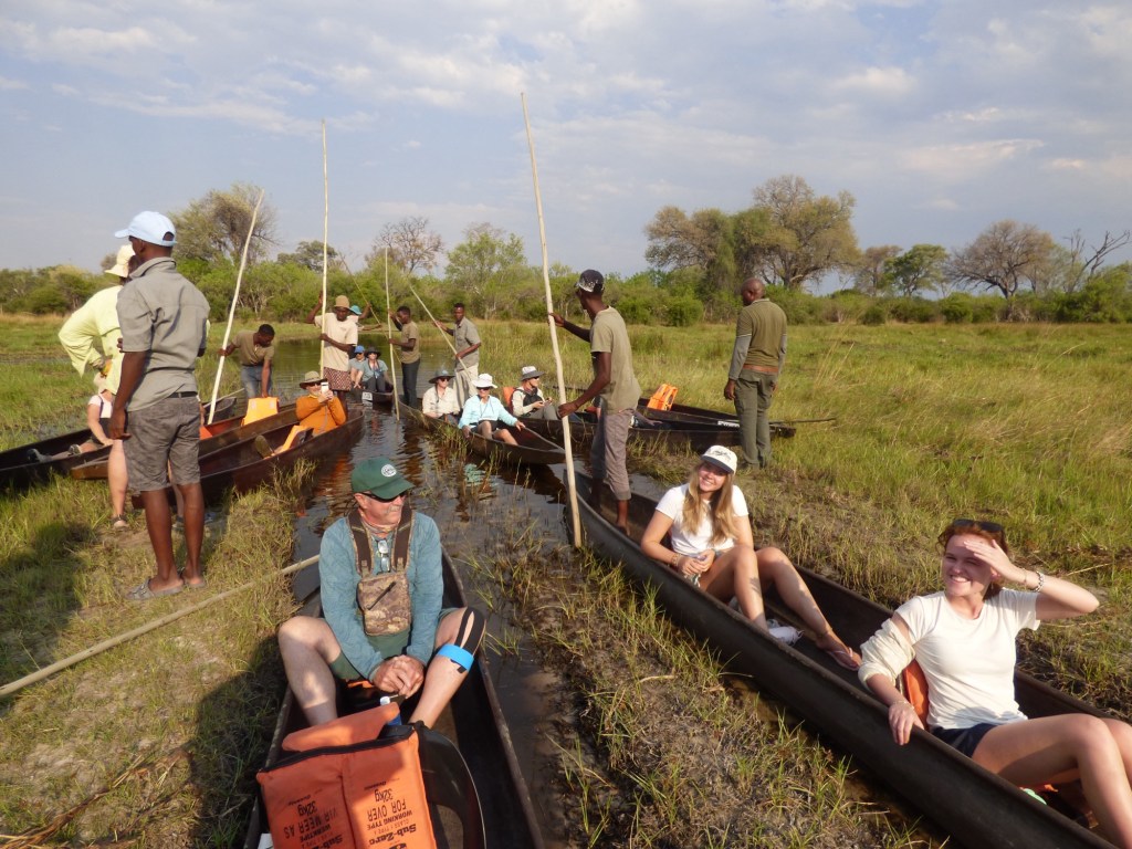 After a round of introductions Punk welcomed us all to the Delta, and gave us a brief orientation to the mokoro canoe – historically dug out of tree branches, now more often found as modified, fiberglass versions like the ones at our feet. They are powered by one person standing in the stern, propelling with a long pole; Punk and his friends would do the work, all we needed to do was sit, be still, and savor the experience. After days of noisy, bumpy, dusty, hot and sweaty overland travel, our group was more than ready.